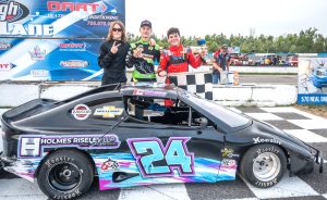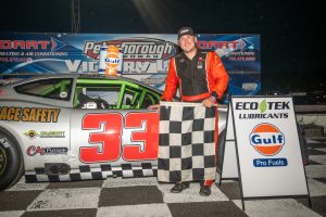 entered the night’s action 8 points in arrears to last week’s feature winner Alex Dallaire – took the early race lead. Jacob Stavropoulos, Cory Horne, Bates and Kali Dearmer were next in line. Stanley was still the race leader and had started to work his way through lapped traffic near the halfway mark, while a hard-charging Stavropoulos kept the leader in his sights. In caution-free feature, Stanley was first across the stripe, followed by Stavropoulos. Horne, Kyle Novis and Bates were next behind the lead duo.
